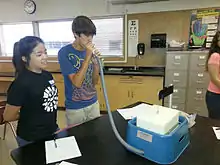 A simple float spirometer being used in a high school science demonstration