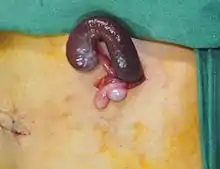 The anomaly was first described in 1883 by Bostroem.[2] Since then more than 150 cases of splenogonadal fusion have been documented.[3] The condition is considered benign.[4] A few cases of testicular neoplasm have been reported in association with splenogonadal fusion.[5][6] The reported cases have occurred in patients with a history of cryptorchidism, which is associated with an elevated risk of neoplasm.[6]