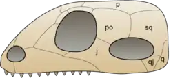 In most tetrapods, the squamosal and quadratojugal bones form the cheek series of the skull.[2] The bone forms an ancestral component of the dermal roof and is typically thin compared to other skull bones.[3]