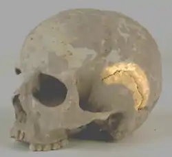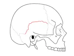 ![]() Side view of the cranium. Squamosal suture in red. | |