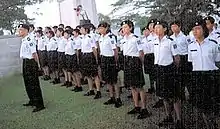 Cadet members are presently only entitled to wear the Field Uniform, which is also the most widely recognised uniform of the St. John Brigade Singapore. The Field Uniform consists of a black beret with a cap badge, depending on which is entitled to the wearer. Nursing members wear a hairnet as well. The top consists of a white short-sleeved shirt / blouse with plastic concealed buttons. For female members, due to the white uniform, bras should be of decent colours if worn. Shoulder flashes bearing the Maltese Cross with twin beasts and unicorns, together with the words "St. John Singapore" are worn on both sleeves. A black epaulette is worn on both shoulders denoting the rank of the member. The bottom consists of black pants / culottes, which is worn with the St. John belt. Black socks and black low-cut boots are worn with the shoelaces tied in the formal-style.