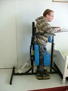 A standing frame (also known as a stand, stander, standing technology, standing aid, standing device, standing box, tilt table) is assistive technology that can be used by a person who relies on a wheelchair for mobility. A standing frame provides alternative positioning to sitting in a wheelchair by supporting the person in the standing position.