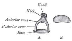 ![]() Frontal view of stapes (A), and view from below (B). | |