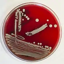 | Staphylococcus condimenti colonies on Columbia sheep blood agar, colonies shown with reflected light (for detecting hemolysis transmitted light is recommended). | |