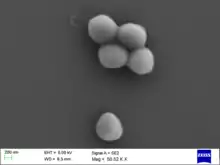 Staphylococcus haemolyticus is a member of the coagulase-negative staphylococci (CoNS).[2] It is part of the skin flora of humans,[3] and its largest populations are usually found at the axillae, perineum, and inguinal areas.[4] S. haemolyticus also colonizes primates and domestic animals.[4] It is a well-known opportunistic pathogen, and is the second-most frequently isolated CoNS (S. epidermidis is the first).[5] Infections can be localized or systemic, and are often associated with the insertion of medical devices.[6][7][8] The highly antibiotic-resistant phenotype and ability to form biofilms make S. haemolyticus a difficult pathogen to treat.[5] Its most closely-related species if Staphylococcus borealis.[9]