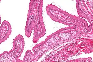 | Micrograph of a steatocystoma showing the characteristic corrugated eosinophilic lining. H&E stain | |