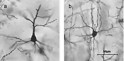 ![]() Golgi stained cortical neurons A) Layer II/IIIpyramidal cell B) layer IV spiny stellate cell | |