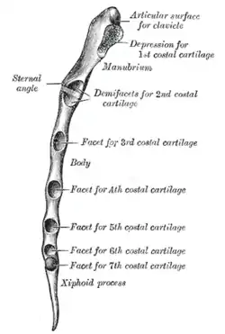 Anterior surface of sternum and costal cartilages. (Sternal angle not labeled, but visible at second costal cartilage.)