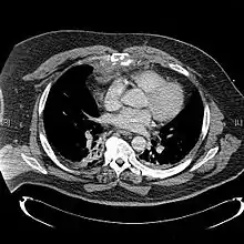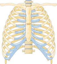 A sternal fracture is a fracture of the sternum (the breastbone), located in the center of the chest. The injury, which occurs in 5–8% of people who experience significant blunt chest trauma, may occur in vehicle accidents, when the still-moving chest strikes a steering wheel or dashboard[1] or is injured by a seatbelt. Cardiopulmonary resuscitation (CPR), has also been known to cause thoracic injury, including sternum and rib fractures. Sternal fractures may also occur as a pathological fracture, in people who have weakened bone in their sternum, due to another disease process.[2] Sternal fracture can interfere with breathing by making it more painful; however, its primary significance is that it can indicate the presence of serious associated internal injuries, especially to the heart and lungs.[3]