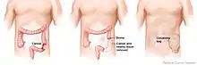 One well-known form of an artificial stoma is a colostomy, which is a surgically created opening in the large intestine that allows the removal of feces out of the body, bypassing the rectum, to drain into a pouch or other collection device. This surgical procedure is invoked usually as a result of and solution to disease in the GIT. The procedure involves bisecting this tube, usually between the later stage of the small intestine (ileum) and the large intestine or colon, hence colostomy, and exiting it from the body in the abdominal region. The point of exiting is what is known as the stoma.