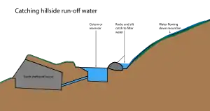 Ground catchments systems channel water from a prepared catchment area into storage. These systems are often considered in areas where rainwater is scarce and other sources of water are not available. If properly designed, ground catchment systems can collect large quantities of rainwater. In arid ranch land, a catchwater or cattle tank can be constructed across shallow ephemeral washes to impound and collect what little stormwater does generate there. This untreated water is easily accessed and utilized by livestock. More intricate collection and processing systems are necessary for stormwater harvest to be reused for human uses.