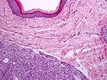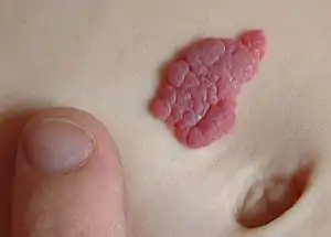 A capillary hemangioma (also known as an Infantile hemangioma,[1] Strawberry hemangioma,[2]:593 and Strawberry nevus[1]) is the most common variant of hemangioma which appears as a raised, red, lumpy area of flesh anywhere on the body, though 83% occur on the head or neck area.[3] These marks occur in about 10% of all births,[4]:81 and usually appear between one and four weeks after birth.[5] It may grow rapidly, before stopping and slowly fading. Some are gone by the age of 2, about 60% by 5 years, and 90–95% by 9 years.[5] Capillary hemangioma is a vascular anomaly.