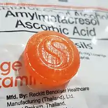Strepsils is a brand of throat lozenges manufactured by Reckitt. Strepsils throat lozenges are used to relieve discomfort caused by mouth and throat infections.[2][3] The primary active ingredients are dichlorobenzyl alcohol and amylmetacresol,[4] with some formulations containing ascorbic acid (vitamin C).[5] Inactive ingredients include menthol, tartaric acid, and propylene glycol.[4]