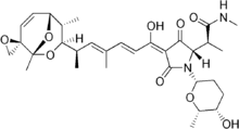 Streptolydigin (Stl) is an antibiotic that works by inhibiting nucleic acid chain elongation by binding to RNA polymerase, thus inhibiting RNA synthesis inside a cell.[1][2][3] Streptolydigin inhibits bacterial RNA polymerase, but not eukaryotic RNA polymerase.[4] It has antibacterial activity against a number of Gram positive bacteria.