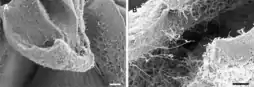 The genus Streptomyces includes aerobic, Gram-positive, filamentous bacteria that produce well-developed vegetative hyphae (between 0.5-2.0 µm in diameter) with branches. They form a complex substrate mycelium that aids in scavenging organic compounds from their substrates.[11] Although the mycelia and the aerial hyphae that arise from them are amotile, mobility is achieved by dispersion of spores.[11] Spore surfaces may be hairy, rugose, smooth, spiny or warty.[12] In some species, aerial hyphae consist of long, straight filaments, which bear 50 or more spores at more or less regular intervals, arranged in whorls (verticils). Each branch of a verticil produces, at its apex, an umbel, which carries from two to several chains of spherical to ellipsoidal, smooth or rugose spores.[11] Some strains form short chains of spores on substrate hyphae. Sclerotia-, pycnidia-, sporangia-, and synnemata-like structures are produced by some strains.