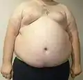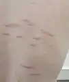 Stretch marks, also known as Striae or Striae distensae,[1] are a form of scarring on the skin with an off-color hue. Over time they may diminish, but will not disappear completely. Stretch marks are caused by tearing of the dermis during periods of rapid growth of the body, such as during puberty or pregnancy. In pregnancy they usually form during the last trimester, and usually on the belly, but also commonly occur on the breasts, thighs, hips, lower back and buttocks; these are known as striae gravidarum.[2] Stretch marks may also be influenced by the hormonal changes associated with puberty, pregnancy, bodybuilding, or hormone replacement therapy. There is no evidence that creams used during pregnancy prevent stretch marks.[3] Once they have formed there is no clearly effective treatment, though various methods have been attempted and studied.[4]