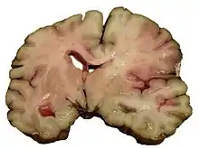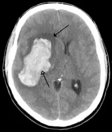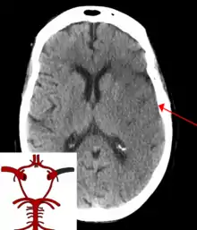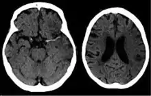 | CT scan of the brain showing a prior right-sided ischemic stroke from blockage of an artery. Changes on a CT may not be visible early on.[1] | |