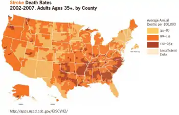 Analysis by the CDC of U.S. mortality statistics from the period 1991 to 1998 found that for both blacks and whites the counties with the highest stroke death rates were in the southeastern states and the Mississippi Delta region. Stroke death rates for states ranged from a high of 169 per 100,000 in South Carolina to a low of 89 per 100,000 in New York.[7] While most observational studies have focused primarily on stroke incidence in adults, in 2004 researchers reported that children in the eleven stroke belt states also have an increased risk of death from ischemic and hemorrhagic stroke compared with children in other states.[8]