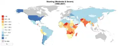 World map of stunted growth for children in different countries (percentage moderate and severe stunting, 1995-2007)