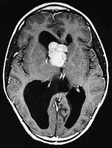 Subependymal giant cell astrocytoma (SEGA, SGCA, or SGCT) is a low-grade astrocytic brain tumor (astrocytoma) that arises within the ventricles of the brain.[1] It is most commonly associated with tuberous sclerosis complex (TSC). Although it is a low-grade tumor, its location can potentially obstruct the ventricles and lead to hydrocephalus.