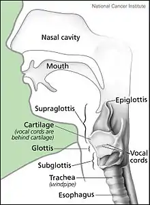 The subglottis or subglottic region is the lower portion of the larynx, extending from just beneath the vocal cords down to the top of the trachea.[1] The structures in the subglottis are implicated in the regulation of the temperature of the breath.[2] Narrowing of the subglottis is known as subglottic stenosis and may require a tracheotomy to correct.[3]