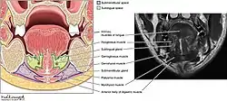 The submandibular space is a fascial space of the head and neck (sometimes also termed fascial spaces or tissue spaces). It is a potential space, and is paired on either side, located on the superficial surface of the mylohyoid muscle between the anterior and posterior bellies of the digastric muscle.[1] The space corresponds to the anatomic region termed the submandibular triangle, part of the anterior triangle of the neck.