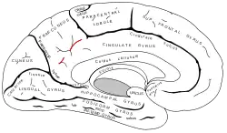 ![]() Medial surface of human cerebral hemisphere. Subparietal sulcus shown in red. | |