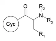Substituted cathinones, which include some stimulants and entactogens, are derivatives of cathinone. They feature a phenethylamine core with an alkyl group attached to the alpha carbon, and a ketone group attached to the beta carbon, along with additional substitutions.[1][2][3][4][5] Cathinone occurs naturally in the plant khat whose leaves are chewed as a recreational drug.[6]