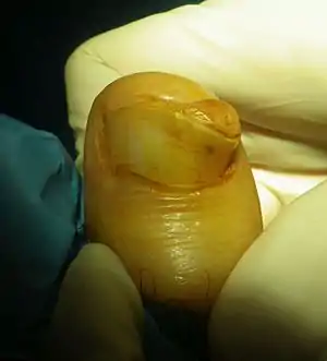 They tend to be painful due to the pressure applied to the nail bed and plate. They can involve destruction of the nail bed.[3] These lesions are not true osteochondromas, rather it is a reactive cartilage metaplasia. The reason it occurs on the dorsal aspect is because the periosteum is loose dorsally but very tightly adherent volarly.[4]Subungal malignant melanomas can also occur in canines.