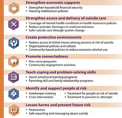 - Preventing Suicide: A Technical Package of Policy, Programs, and Practices (PDF). CDC. 2017. p. 7. Retrieved 3 December 2019.