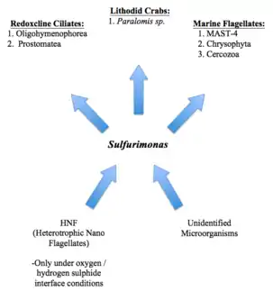 Sulfurimonas (subgroup GD17) dominates chemotrophic denitrification in the Baltic Sea pelagic redoxclines.[14][13][6] Using methods such as predator assays and bacterial amendment cultures, it was found that the population of Sulfurimonas (subgroup GD17) had a doubling time of 1 to 1.5 days, which is much more than their average doubling time under the optimal conditions shown in Table 1.[22] However, grazing can consume the population over the course of one day.[22] Five active grazers that are typically found in redoxclines ciliates (Oligohymenophorea, Prostomatea), and marine flagellate groups (MAST-4, Chrysophyta, Cercozoa), were found through the use of RNA-SIP.[22] In cold-seep ecosystem, Lithodid crabs (Paralomis sp.), which are filter eaters, feed on thiotropic bacterial mats, which consist of many different types of bacteria.[22]