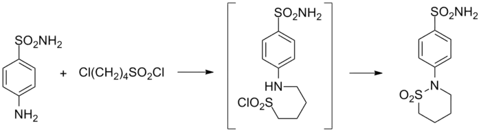 p-Aminobenzenesulfonamide can be alkylated by ω-chlorobutylsulfonyl chloride in base via presumed intermediate (middle), which spontaneously cyclizes to give sulthiame.