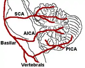![]() The three major arteries of the cerebellum: the SCA, AICA, and PICA. | |