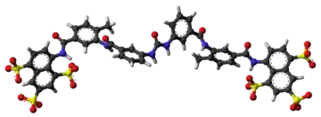 The molecular formula of suramin is C51H40N6O23S6. It is a symmetric molecule in the center of which lies a urea (NH–CO–NH) functional group. Suramin contains six aromatic systems – four benzene rings, sandwiched by a pair of naphthalene moieties – plus four amide functional groups (in addition to the urea) and six sulfonic acid groups. When given as a medication, it is usually delivered as the sodium sulfonate salt as this formulation is water-soluble, though it does deteriorate rapidly in air.[12]
