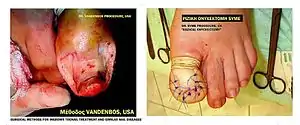 The Vandenbos procedure was first described by Vandenbos and Bowers in 1959 in the US Armed Forces Medical Journal.[3] They reported on 55 patients, all without recurrences. Since 1988 Dr. Henry Chapeskie has performed this procedure on over 2,700 patients who had no recurrences. Unlike other procedures, the Vandenbos procedure does not touch the nail. In this procedure, the affected toe is anesthetized with a digital block and a tourniquet is applied. An incision is made proximally from the base of the nail about 5 mm (leaving the nail bed intact) then extended toward the side of the toe/toenail in an elliptical sweep to end up under the tip of the nail about 3–4 mm in from the edge. It is important that all the skin at the edge of the nail be removed. The excision must be adequate leaving a soft tissue deficiency measuring 1.5 × 3 cm. A portion of the lateral aspect of the distal phalanx is occasionally exposed without fear of infection. Antibiotics are not necessary as the wound is left open to close by secondary intention. Postoperative management involves soaking of the toe in warm water 3 times/day for 15–20 minutes. The wound is healed in 4–6 weeks. No cases of osteomyelitis have been reported. After healing, the nail fold skin remains low and tight at the side of the nail. The rationale is that the nail itself is usually healthy, but overgrown by skin; when walking, the bilateral nail folds are pressed upwards, which is why narrowing the nail causes excessive recurrences, contrary to narrowing the nail fold.[4]