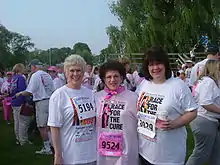 In 2008, the 25th anniversary of the organization, the name was changed to Susan G. Komen for the Cure and trademarked a new logo in support of its promise "to end breast cancer forever."[21] The new logo is a pink ribbon that resembles a runner in motion[21][22] and is meant to reflect the importance of Komen's signature Race for the Cure event,[22] the world's largest fund-raising event for breast cancer education and research.[23] The logo symbolically associates the organization with the values of breast cancer awareness ("pink ribbon culture"): fear of breast cancer, hope, and the charitable goodness of people and businesses who publicly support the breast cancer movement.[4]