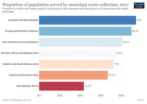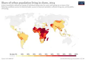 The number of slum dwellers reached more than 1 billion in 2018, or 24 per cent of the urban population.[6] The number of people living in slums or informal settlements is highest in Eastern and South-Eastern Asia, sub-Saharan Africa and Central and Southern Asia.[6] In 2019, only half of the world's urban population had convenient access to public transport, defined as living within 500 meters' walking distance from a low-capacity transport system (such as a bus stop) and within 1 km of a high-capacity transport system (such as a railway).[6] In the period 1990–2015, most urban areas recorded a general increase in the extent of built-up area per person. Many regions recorded a consistent increase in the built-up area per capita, with Australia and New Zealand recording the highest values.[6]