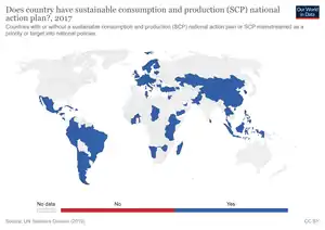 By 2019, 79 countries and the European Union have reported on at least one national policy instrument to promote sustainable consumption and production patterns.[5]:14 This was done to work towards the implementation of the "10-Year Framework of Programmes on Sustainable Consumption and Production Patterns".[5]:14