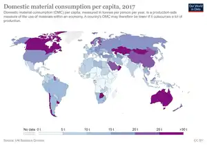 Material Footprint is the quantity of material extraction that is required to meet the consumption of a country. The sum of material footprint for biomass, fossil fuels, metal ores and non-metal ores is called the total material footprint.[2] Domestic Material Consumption (DMC) is a production-side measure which does not account for supply chain inputs or exports, meaning a country could have a lower DMC value if it outsources a large proportion of its materials.[2]