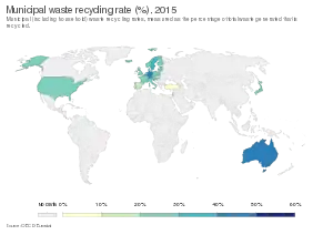 "Minimizing waste generation and maximizing the recycling of waste is central to the concept of circular economy."[18] This indicator measures the quantity of material recycled within the country, plus the material that is exported to be recycled abroad, minus the material that countries imported to be recycled inside the country per year. These three different aspects are defined as the National Recycling Rate.[18]