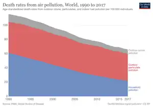 Household air pollution is estimated to cause half of all pneumonia deaths Among children under age 5. The global mortality rate from unintentional poisonings decreased by 33% between the years 2000 and 2015 but still causes 108,000 deaths annually.[15]:6