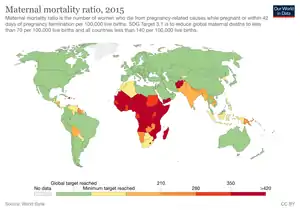 Target 3.1 aims to reduce maternal mortality to less than 70 deaths per 100,000 live births.[16] Though the maternal mortality ratio declined by 37 percent between 2000 and 2015, there were approximately 303,000 maternal deaths worldwide in 2015, most from preventable causes.[9] In 2015, maternal health conditions were also the leading cause of death among girls aged 15–19.[9] Data for girls of greatest concern – those aged between 10 and 14 years is currently unavailable. Key strategies for meeting SDG 3 will be to reduce adolescent pregnancy (which is strongly linked to gender equality), provide better data for all women and girls, and achieve universal coverage of skilled birth attendants.[9]