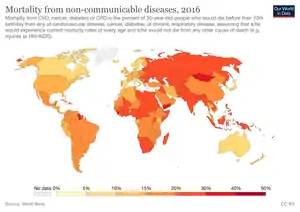 The UNDP reports that "every 2 seconds, someone aged 30 to 70 years dies prematurely from noncommunicable diseases - cardiovascular disease, chronic respiratory disease, diabetes or cancer."[6]