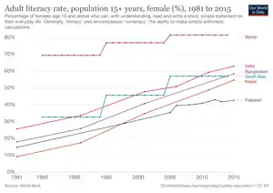 In 2016, two-thirds of 750 million adults are women who are illiterate. Adult literacy rates are lowest in sub-Saharan Africa and Southern Asia. Southern Asia alone is home to nearly half (49 per cent) of the global population who are illiterate.[15]