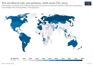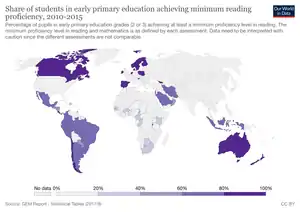 Progress is difficult to track as 75 per cent of countries have no or insufficient data to track progress towards SDG Goal 4 targets for learning outcomes (target 1), early childhood education (target 2), and effective learning environments.[8] Data on learning outcomes and pre-primary school are particularly scarce; about 70% of countries partially or fully lack adequate data to evaluate progress made so far, this include countries with high income that are expected to have achieved the target or to be on track to achieve it.[8] 40 per cent of nations around the world have insufficient accessible data with respect to organized learning at least a year before their primary education.[8] This makes it hard to analyse and identify the children at greatest risk of being left behind. A 2019 study used computer modelling to estimate educational attainment for men and women from 2000 to 2017, mapping the results for each country to help identify areas lagging behind.[24]