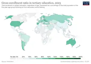 In terms of the progress made, global participation in tertiary education reached 224 million in 2018, equivalent to a gross enrollment ratio of 38%.[14] North Africa and West Asia are among top regions with the most rapid expansion of tertiary education participation since 2013.[14]