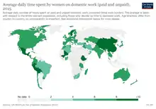 Unpaid care and domestic work includes cooking and cleaning, fetching water and firewood or taking care of children and the elderly. Women carry out at least two and a half times more unpaid household and care work than men. As a result, women have less time to engage in paid labor, work longer hours, combining paid and unpaid labor.[22]