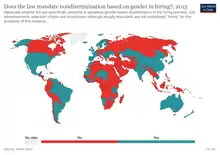 This means the indicator works towards the legal frameworks which can be applied to promote and enforce non-discrimination on the basis of sex across various measures including hiring, equal pay, marital rape and property rights, among others.[12][14]