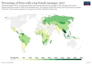 In 2019, 28 per cent of managerial positions in the world were occupied by women, a small increase from 25 per cent in 2000, while women represented 39 per cent of the world's workers and half of the world's working-age population.[24]