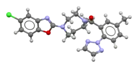 Suvorexant is a selective, dual orexin receptor antagonist (DORA) made by Merck & Co. It was approved for sale by the U.S. Food and Drug Administration (FDA) on August 13, 2014.[3] The U.S. Drug Enforcement Administration (DEA) placed it on the list of schedule IV controlled substances,[4] as it may lead to limited physical dependence or psychological dependence relative to the drugs or other substances in schedule IV. The potential for psychological dependence is similar to that of zolpidem.[5]
